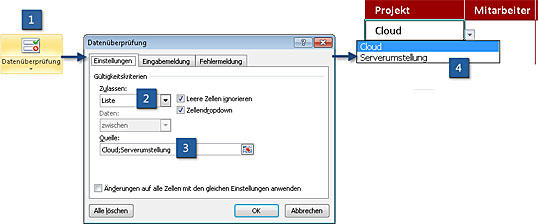 - Markieren Sie im Dialogfeld "Datenüberprüfung" den Eintrag "Liste" [2]. Tragen Sie in das Eingabefeld unter "Quelle" [3] die beiden durch ein Semikolon getrennten Projektnamen ein: Cloud;Serverumstellung. Schließen Sie mit OK ab.