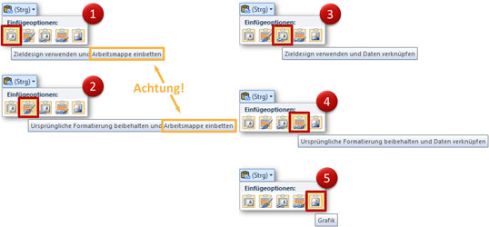 Nach dem Einfügen des Diagramms mit Strg+V erscheint am rechten unteren Rand das Symbol Einfüge-Optionen. Klicken Sie dort auf die Pfeilspitze (alternativ Strg-Taste), um die Auswahl zu öffnen. Bild 2 zeigt die verfügbaren Optionen im Detail.