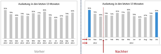 In solchen Fällen ist es hilfreich, wenn Sie die Daten des aktuellen Jahres von denen des vorangegangenen optisch trennen. In Bild 1 sehen Sie rechts eine Lösung, die für eine optische Unterteilung der Jahre sorgt. Dazu dient einerseits eine senkrechte Trennlinie und andererseits die Unterteilung der Zeitachse in Jahre und Monate. Zudem heben sich die Säulen für den aktuellen und den Vorjahresmonat gut ab und lenken somit die Aufmerksamkeit und den Blick des Betrachters.