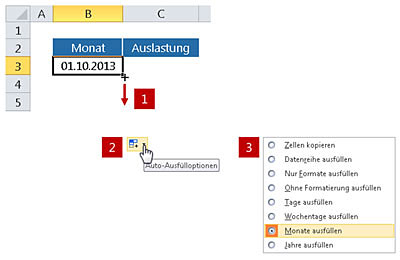 - Tragen Sie das Startdatum (im Beispiel: 1.10.2013) in Zelle B3 ein und kopieren Sie es durch Ziehen am Ausfüllkästchen nach unten bis B15 (vgl. Bild 2 [1]). Damit Excel eine fortlaufende Monatsreihe erzeugt, klicken Sie an der rechten unteren Ecke des eben ausgefüllten Bereichs auf das Symbol Auto-Ausfülloptionen (Bild 2 [2]) und wählen Sie im Untermenü den Eintrag Monate ausfüllen (Bild 2 [3]).