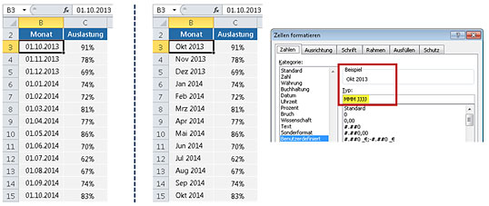 Bild 3: Verwenden Sie statt des Standard-Datumsformats TT.MM.JJJJ (links) das rechts gezeigte Format MMM JJJJ.