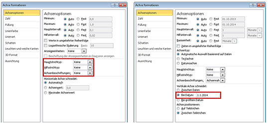 - Markieren Sie nun die waagerechte Achse. Verschieben Sie die Position der senkrechten Achse so, dass sie als Trennlinie zwischen den beiden Jahren dienen kann. Wählen Sie dazu unter "Vertikale Achse schneidet" die in Bild 6 rechts gezeigte Einstellung "1.1.2014".
