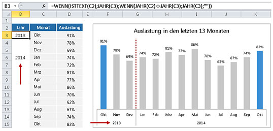 - Ergänzen Sie zum Schluss noch einen aussagekräftigen Diagrammtitel, beispielsweise "Auslastung in den letzten 13 Monaten".