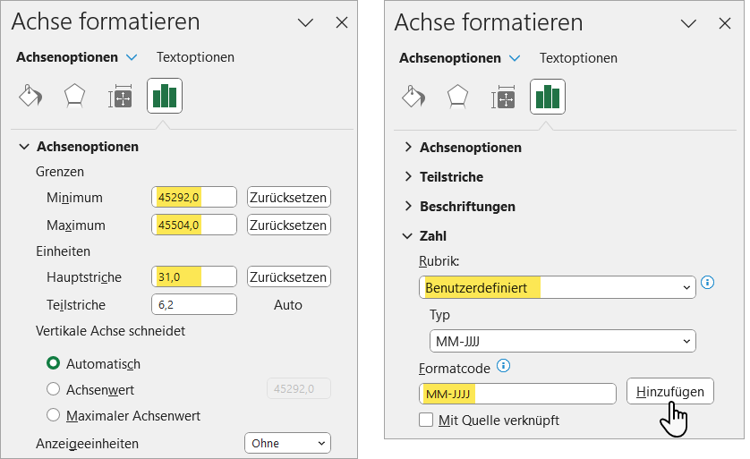 • Tragen Sie unter Achsenoptionen in die Eingabefelder neben Minimum und Maximum die Datumsangaben 1.1.2024 und 31.07.2024 ein (Bild 5 links).