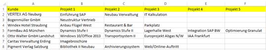 Wesentlich universeller ist die hier gezeigte Lösung, die eine Konstruktion aus Bedingungs- und Matrixfunktionen verwendet, um Zeilen- in Spaltenwerte umzuwandeln. Die Formelauswertung passt sich dabei variabel der wechselnden Anzahl von Projekten pro Kunde an.