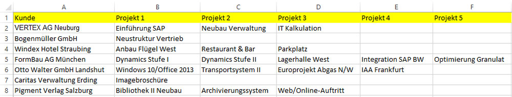 Bild 2: Ziel der Transponierung ist eine Liste, in der jeder Kunde nur einmal gelistet ist, wobei die Projekte dem Kunden in Spalten zugeordnet sind.