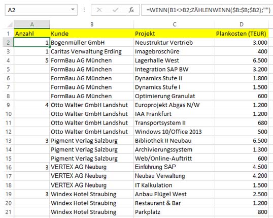 Nachdem Sie als Vorbereitung die Projektliste sortiert haben, ermitteln Sie mit der Funktion ZÄHLENWENN(), wie oft jeder Kunde gelistet ist. Das Ergebnis ist die Anzahl der Projekte pro Kunde.