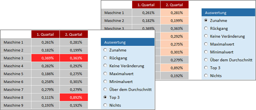 Ohne die nachfolgenden Schritte würde das Ergebnis allerdings recht bunt aussehen, da Excel alle Hervorhebungen gleichzeitig anzeigt. Als nächstes müssen Sie daher den visuellen Teil der Auswertung mit interaktiven Bedienelementen kombinieren. Über diese können Sie wählen, welche Auswertung jeweils aktiv sein soll.