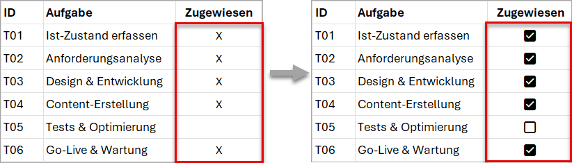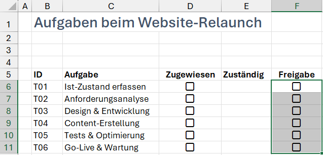 Die neuen Kontrollkästchen lassen sich wesentlich vielseitiger einsetzen und können im Projektmanagement z.B. verwendet werden, um Aufgaben effizient zu verfolgen und Statusinformationen übersichtlich zu visualisieren und zu verwalten. Kontrollkästchen erleichtern zudem das schnelle Filtern zwischen offenen und erledigten Aufgaben, unterstützen Berechnungen und vereinfachen die Auswahl von Optionen.