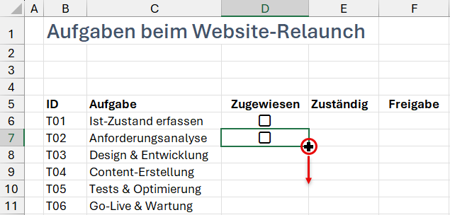 Möchten Sie ein Kontrollkästchen in alle Zellen einer Spalte kopieren, können Sie dazu das Ausfüllkästchen verwenden: Ziehen Sie dieses einfach nach unten (Bild 4).