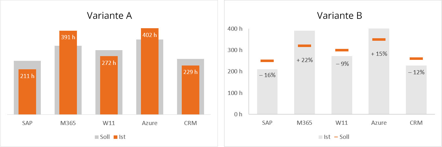 - In der links gezeigten Variante A werden die Soll-Werte nicht explizit angezeigt, sondern durch graue Flächen dargestellt. Das reduziert die Anzahl der Informationen, die aufgenommen und verarbeitet werden müssen.