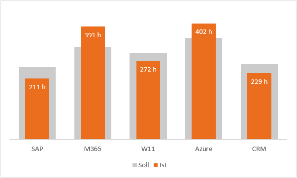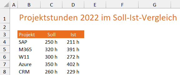 - Auf den zweiten Blick ergibt sich dann der beabsichtigte Vergleich zu den Soll-Werten und die Erkenntnis, bei welchen Projekten die Ist-Stunden unter oder über den Soll-Stunden liegen.