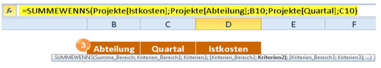 =SUMMEWENNS(Projekte[Istkosten];Projekte[Abteilung];B10;Projekte[Quartal];C10).