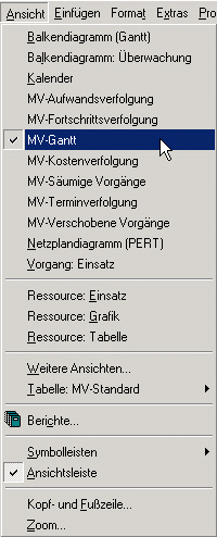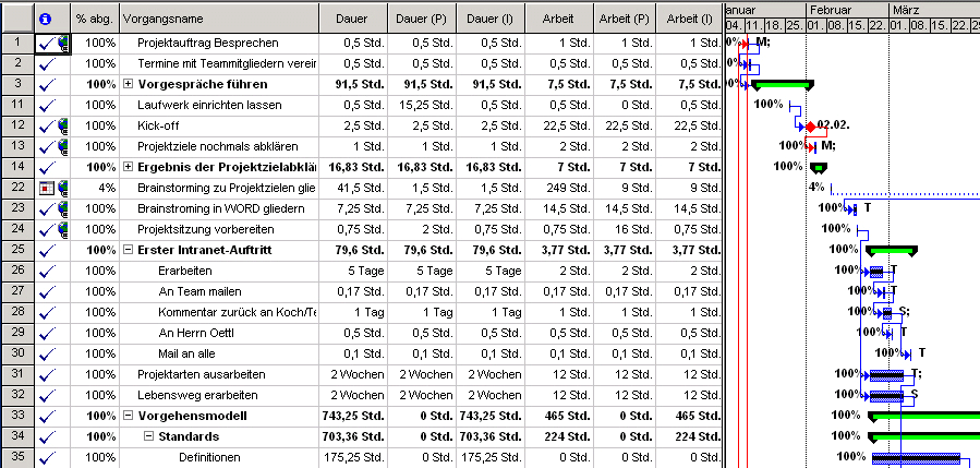 - Definieren und Realisieren unternehmensspezifischer Tabellen/ Ansichten/ Filter: Es wurden lediglich fünf für alle verbindliche Tabellen und darauf aufbauende Ansichten für Standardeingabe, Fortschritts-, Aufwands-, Termin-, und Kostenverfolgung eingerichtet. In diesen wurden die Spaltenköpfe teilweise umbenannt, Spalten neu eingefügt ( "% Arbeit abgeschlossen") und deren Reihenfolge angepasst. Ferner wurden eigene Filter für a) überfällige und b) verschobene Vorgänge integriert.