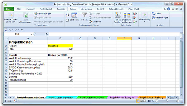 In unserem ersten Beispiel, das Sie auch in der mitgelieferten Beispieldatei finden, sind die Projektkosten für laufende Projekte auf mehrere Tabellenblätter verteilt. Jedes Blatt gibt die Daten für eine bestimmte Region wieder. Die darin enthaltene Tabelle listet die Projekte in dieser Region auf und gibt die dafür anfallenden Kosten, die Gesamtsumme sowie den Plankostenwert an (Bild 1). Der Aufbau ist für alle Tabellen identisch, die Datenbereiche sind – abhängig von der Anzahl an Projekten pro Region – unterschiedlich groß. Die regionalen Projektkosten sollen in einem separaten Tabellenblatt zu einer Gesamtkostenübersicht zusammengeführt werden, um diese z.B. für eine Besprechung oder eine Präsentation verwenden zu können.