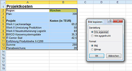 Das Dialogfeld "Bild kopieren" bietet zwei Optionen für die Darstellung (Bild 2): "Wie angezeigt" lichtet den Bereich so ab, wie er am Bildschirm zu sehen ist, also mit Gitternetzlinien (falls diese im Seitenlayout aktiv sind), mit allen Farben und Zellmustern und der gewählten Schriftformatierung. "Wie ausgedruckt" verwendet dagegen die Ausgabeformatierungen des Druckers. Sind für den Ausdruck z.B. die Gitternetze abgeschaltet oder die Zeilen- und Spaltenköpfe der Tabelle aktiviert, wird dies auch in der Abbildung so zu sehen sein.