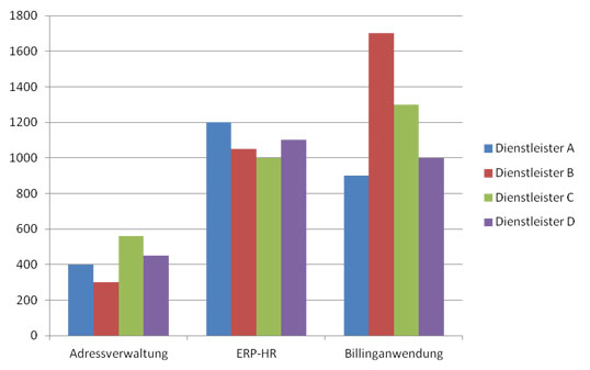 In Bild 1 sind für drei Projekte (Adressverwaltung, ERP-HR und Billing-Anwendung) die angebotenen Preise von vier Dienstleistern je Liefereinheit, d.h. Euro pro Function Point, angegeben. Die Daten entsprechen in ihrer Höhe und Varianz unseren Erfahrungen bei Ausschreibungen für Software-Entwicklungen. Es ist durchaus üblich, dass für verschiedene Projekte jeweils andere Anbieter das beste Preis-Leistungs-Verhältnis bieten, so ist in Bild 1 für die Adressverwaltung Anbieter B, für das ERP-HR-Projekt Anbieter C und für die Billing-Anwendung Anbieter A der preislich günstigste.