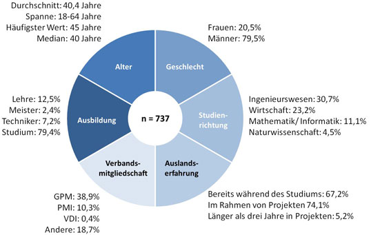 Die Gehalts- und Karrierestudie 2013, die von der EBS Universität für Wirtschaft und Recht im Auftrag der GPM durchgeführt wurde, fand in Form einer standardisierten Online-Befragung von Mai bis Juli 2013 statt. An der Befragung beteiligten sich insgesamt 913 Personen; nach Bereinigung der Daten um nicht vollständig ausgefüllte Fragebögen und nicht plausible Datensätze, ergab sich eine Netto-Stichprobe von 737 Fällen.