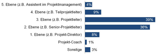 Die Mehrheit der Befragten ist in einer leitenden Funktion im Projektmanagement tätig. So sind 9% als Teilprojektleiter (Ebene 4), 39% als Projektleiter (Ebene 3), 36% als Senior-Projektleiter (Ebene 2) und 8% als Projekt-Direktor (Ebene 1) beschäftigt (Bild 3).