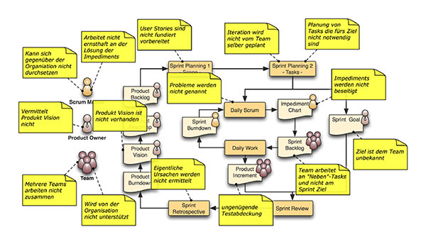 Sollte die Organisation, in der das Projekt durchgeführt wird, insgesamt jedoch nicht hinter der Methode Scrum stehen und die Einführung eher kritisch sehen, lassen sich die Impediments alleine durch den Scrum Master häufig nicht lösen. Hier gilt es, wie bei jedem Change-Projekt, Aufklärungsarbeit zu leisten, die Organisation von dem Vorgehen Scrum zu überzeugen und eine für Scrum funktionierende Umgebung zu schaffen.