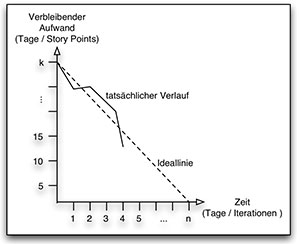 Die vertikale Achse zeigt den Restaufwand gemessen in Tagen oder Stunden im aktuellen Sprint. Die horizontale Achse stellt die Tage des Sprints dar.