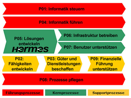 Das ISB entwickelt, pflegt und veröffentlicht die Methode im Namen der Bundesverwaltung, welche die Eigentümerin der Methode ist (ISB, Hermes Website). Sie stellt diese für alle Interessierten frei zur Verfügung. Innerhalb der Informatik-Prozesslandschaft des Bundes ist HERMES als Methode für den Kernprozess P05 "Lösungen entwickeln" (s. Bild 1) als Standard vorgegeben (ISB, Website des ISB):