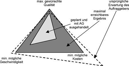 Die erste Schlussfolgerung führt zu der Erkenntnis, dass das magische Zieldreieck aus Qualität, Geschwindigkeit und Kosten in Wirklichkeit nicht nur aus einem, sondern aus drei unterschiedlichen Zielsystemen besteht (Bild 1). Einerseits ergeben die zwischen Projektmanager und Auftraggeber verhandelten Eckdaten (der Plan) ein Zieldreieck. Dem gegenüber steht der ursprüngliche Wunsch des Auftraggebers. Zwischen beiden liegt meist das physikalisch oder physiologisch maximal Erreichbare.
