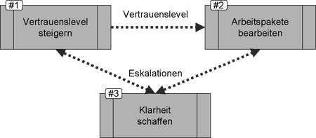 Lose Kopplung: Die drei Prozesse sind nur lose miteinander gekoppelt - sie haben wenige Schnittstellen und müssen nur wenig Information austauschen. Aus dem Prozess #1 "Vertrauenslevel steigern" wird nur die Information über den aktuellen Vertrauenslevel eines Teammitglieds in Prozess #2 "Arbeitspakete bearbeiten" zur Steuerung der Arbeitspaketgröße verwendet. Der Prozess #3 "Klarheit schaffen" erhält seinen Input in Form von Eskalationen aus den beiden anderen.
