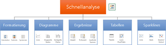 Damit die Schnellanalyse funktioniert, muss der markierte Bereich aus zusammenhängenden Zeilen und Spalten bestehen. Es ist nicht möglich, beispielsweise nur die erste und dritte Spalte einer Datenliste auszuwählen. Befinden sich innerhalb der Markierung ausgeblendete Zeilen oder Spalten, werden diese von der Schnellanalyse mitberücksichtigt.