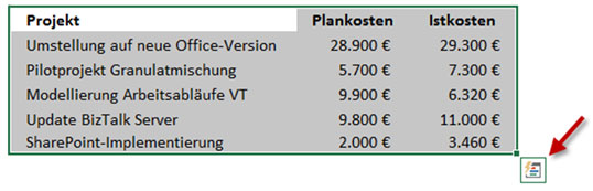 Bild 2: Das Symbol zum Starten der Schnellanalyse erscheint an der rechten unteren Ecke des markierten Bereichs.