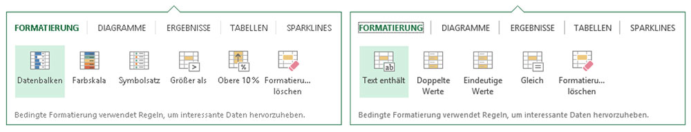 Die Schnellanalyse bietet zahlreiche Möglichkeiten, mit denen Sie Daten optisch hervorheben können. In der Rubrik Formatierung stehen Ihnen die in Bild 3 gezeigten Varianten zur Verfügung. Alle Varianten sind der Funktion Bedingte Formatierung entnommen; sie können also auch über die Befehlsfolge Start / Bedingte Formatierung zugewiesen werden – aber eben mit weniger Bedienkomfort. Welche Optionen Excel Ihnen anbietet, hängt davon ab, welche Art von Werten Sie zuvor markiert haben: Zahlen, Text oder Datumsangaben.