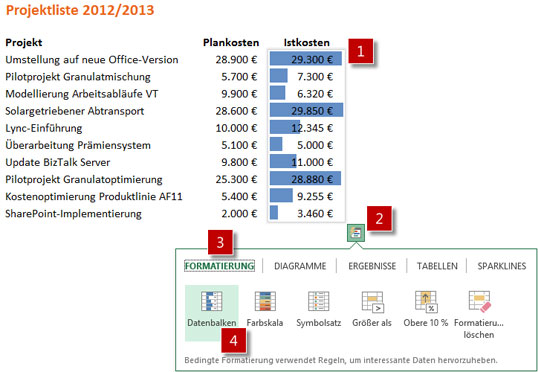 Seit kurzem ist das neue Office 2013 auf dem Markt, wobei sich die meisten nützlichen Neuerungen in Excel finden. Wer seine Projekte mit Excel auswertet, wird eine neue Funktion besonders schätzen: die Schnellanalyse. Mit ihr lassen sich informative wie auch optisch ansprechende Auswertungen anlegen – und zwar ohne Formeln eingeben zu müssen und ohne Kenntnisse zu den Themen "Bedingte Formatierung", "Diagramme" oder gar "Pivot". Die Auswertungsmöglichkeiten reichen von nützlichen Berechnungen und intelligenten Tabellen über visuelle Darstellungen wie Datenbalken, Sparklines oder Diagramme bis hin zu professionellen Pivot-Tabellen und Pivot-Diagrammen. Das Arbeiten mit Excel wird damit produktiver und für wenig geübte Anwender zudem deutlich leichter.