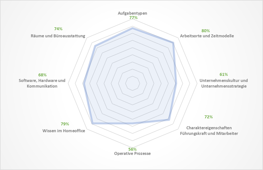 Anschließend beantworten wir die eingangs aufgeworfenen Fragen und stellen Ihnen die Einzelkriterien der Homeoffice-Readiness-Methode vor. Diese werden in ein Radardiagramm (umgangssprachlich Spinnendiagramm) überführt (Bild 1). Die Vorlage zur Berechnung ist als Arbeitshilfe beigefügt.