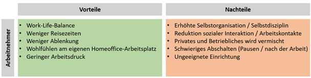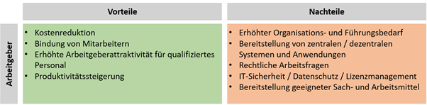 Aus Unternehmenssicht sind folgende Vor- und Nachteile zu nennen: Vorteile können die Kosteneinsparungen von variablen Betriebskosten und/oder eine Verringerung von Fixkosten (z.B. Betriebsräume) sein. Zudem empfinden die meisten Mitarbeiter ihren Arbeitsplatz als attraktiver, was zur langfristigen Bindung an das Unternehmen führen kann und zusätzlich qualifiziertes Personal aus anderen Regionen anlocken kann (siehe BMFSFJ 2014). Zudem arbeiten einige Mitarbeiter produktiver. Die Nachteile sind insbesondere erhöhte Anforderungen an die Organisation des Heimarbeitsplatzes und die Führung der Mitarbeiter. Eine weitere Herausforderung ist die Bereitstellung von geeigneten, anforderungsgerechten zentralen sowie dezentralen technischen Systemen und Anwendungen (z.B. Dokumentenmanagement, Kollaborationsplattformen). Der Arbeitgeber muss sich mit (teilweise unklaren) rechtlichen Arbeits-, Versicherungs- und Haftungsfragen auseinandersetzen. Auch müssen Organisationsstrukturen, z.B. zur Fehlerbehebung, vorhanden sein und Maßnahmen ergriffen werden hinsichtlich IT-Sicherheit, Datenschutz und Lizenzmanagement.