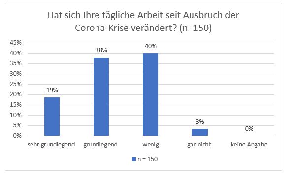 Trotzdem gab nur gut die Hälfte an, dass sich ihre tägliche Arbeit durch die Krise grundlegend bzw. sogar sehr grundlegend verändert hat. Immerhin 43% haben den Eindruck, dass sich ihre Arbeitsweise wenig bis gar nicht verändert hat.