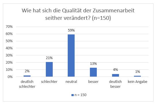 Besonders interessant: Die Frage, wie sehr die Qualität der Zusammenarbeit unter diesem hohen Anteil an Homeoffice-Arbeit gelitten hat. Überraschender Weise war das Ergebnis fast neutral. Nur 23% der Befragten empfinden die aktuelle Situation als "schlechter" oder gar "deutlich schlechter", während 17% die Situation sogar besser bzw. 4% "deutlich besser" empfanden.