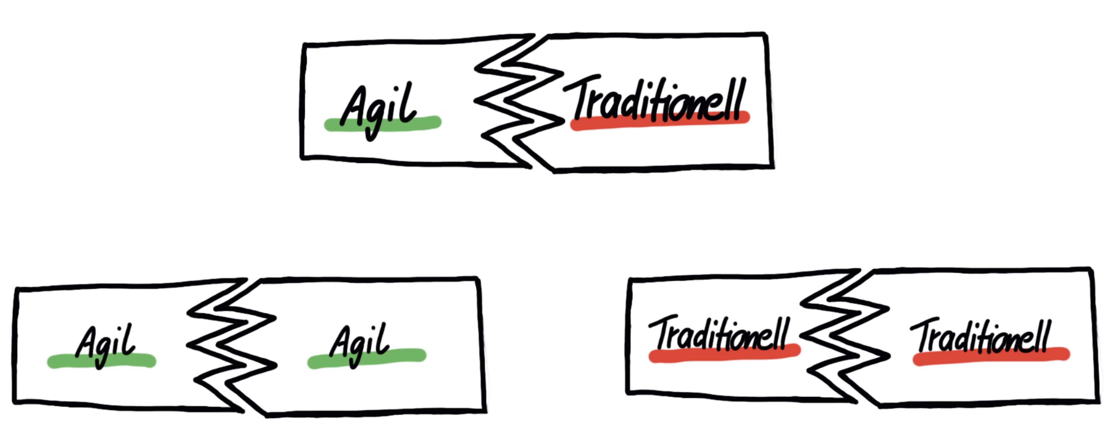 Die Motivation hinter hybriden Ansätzen im Projektmanagement ist es häufig, die Vorteile von Agilität mit der Sicherheit der bekannten Vorgehensweisen zu kombinieren. Das Management denkt dann in einer Formwl, wie… Scrum + Prince2 = Geschwindigkeit * niedriges Risiko. Leider widersprechen sich die Ansätze und heben einander auf. Es wird keines, der gewünschten Ergebnisse erzielt.
