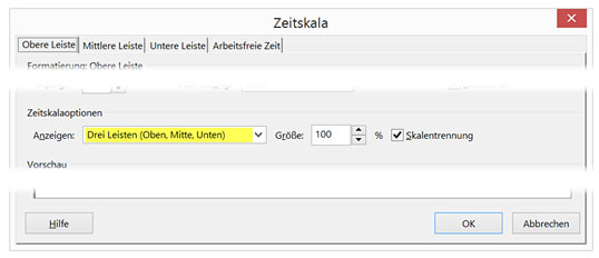 Fügen Sie zunächst eine dritte Leiste hinzu, indem Sie im Bereich Zeitskalaoptionen / Anzeigen die Option "Drei Leisten (Oben, Mitte, Unten)" auswählen (Bild 2).