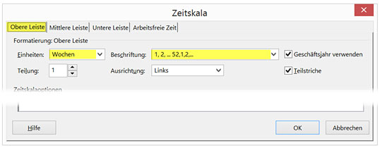 Als Formatierung für die dritte Spalte (Registerkarte Obere Leiste) wählen Sie als Einheiten die Option "Wochen" und als Beschriftung die Option: "1,2,…52,1,2…". Project zeigt jetzt in der oberen Leiste zusätzlich die Kalenderwochen an. Über die Optionen Teilstriche und Skalentrennung können Sie noch die Trennlinien ein- und ausblenden. Klicken Sie anschließend auf OK.