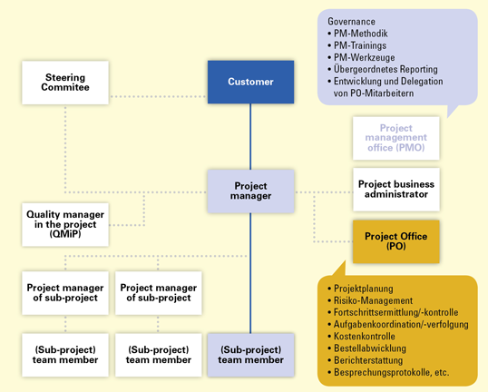 Zehn bis 15 Projekte sind dabei von strategischer Natur – es handelt sich hier um komplexe Projekte mit einem hohem Budgetbedarf und besonders hoher Geschäftsrelevanz. Das Management dieser IT-Projekte verantworten i.d.R. Projektleiter aus dem Segment "Globale strategische Projekte". Darüber hinaus existiert ein zentrales Project Management Office, das vor allem Governance-Aufgaben wie etwa die Weiterentwicklung der Projektmanagement-Methodik, das zentrale Projekt-Reporting für das Management oder die Entwicklung der Nachwuchskräfte für das Projektmanagement übernimmt. Zur Unterstützung der vielfältigen Aufgaben der Projektleiter wird in strategischen Projekten i.d.R. ein eigenes Project Office zugeordnet und personell ausgestattet. Die typische Projekt-Organisation ist in Bild 1 zu sehen.