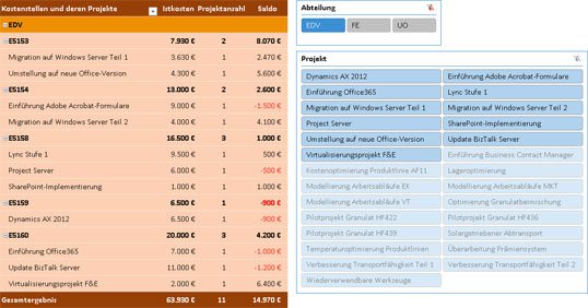 Bild 2: Eine Pivot-Tabelle (links), in der dank Datenschnitt (rechte Seite) nur die Ergebnisse der Abteilung EDV zusammengefasst sind.