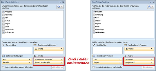 Bild 2: Die Feldliste der Pivot-Tabelle mit den ursprünglichen (links) und den umbenannten Feldbezeichnungen (rechts).