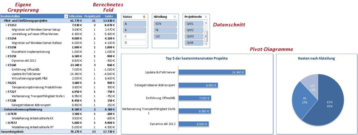 Pivot-Tabellen sind ein sehr effizientes Werkzeug, um Projektdaten ohne jegliche Formeleingabe auszuwerten und die Ergebnisse übersichtlich darzustellen. Erfahren Sie in diesem zweiten und letzten Teil, wie Sie die Aussagekraft von Pivot-Auswertungen nochmals deutlich erhöhen, indem Sie diese mit folgenden Zusatzelementen zu einem interaktiv bedienbaren Kosten-Cockpit erweitern: