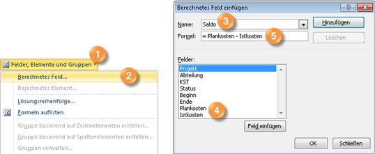 - Öffnen Sie das Dialogfeld zum Einfügen eines berechneten Felds, indem Sie in die Pivot-Auswertung klicken und auf der Registerkarte PivotTable-Tools / Optionen in der Gruppe Berechnungen die Befehlsfolge Felder, Elemente und Gruppen (1) / Berechnetes Feld (2) anklicken.