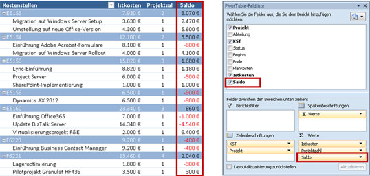 Sie sehen in der Pivot-Tabelle jetzt eine neue Spalte (Bild 5 links). In der zugehörigen Feldliste (Bild 5 rechts) steht das neue Feld Saldo, für das unten im Wertebereich eine Summierung durchgeführt wird.