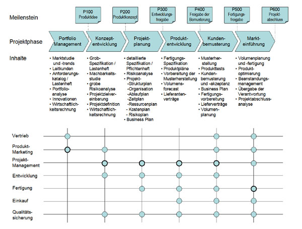 Bild 1 stellt den Projektmanagement-Gesamtprozess mit den Projektphasen, den entsprechenden Projektinhalten und den Verantwortlichkeiten dar. Es handelt sich um einen typischen Produktentwicklungsprozess, der mit der Produktidee startet und mit der Übergabe des Produkts an die Fertigung endet.