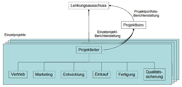 Die Mitglieder der Projektteams stammen in der Regel aus verschiedenen Fachabteilungen. In unserem Beispiel sind das Vertrieb, Marketing, Entwicklung, Einkauf, Fertigung und Qualitätssicherung. Die Teams und der Datenfluss sind in Bild 2 schematisch dargestellt. Die Projektleiter berichten in regelmäßigem Turnus und in den Projektstatussitzungen an den Lenkungsausschuss und das Projektbüro.