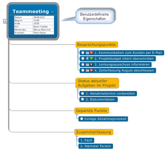 Zur Vorbereitung einer Besprechung gehört es nicht nur, eine Einladung zu verschicken, sondern auch eine strukturierte Agenda zu erstellen. Sie können diese übersichtlich als Map gestalten und allen Beteiligten im Vorfeld zur Verfügung stellen, damit sich diese auf die Themen vorbereiten können. Die Map sollte nicht nur die Agendapunkte enthalten, sondern zusätzlich auch Angaben zu Zeit, Ort, Moderator, Protokollant, Teilnehmer usw. (Bild 1).
