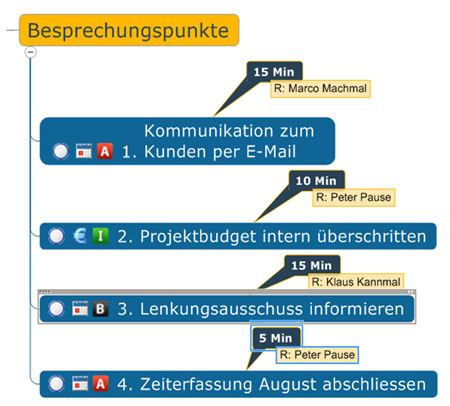 Da die Agenda bereits als Mindmap vorliegt, können Sie diese gleich für die Besprechung nutzen, anstatt alles noch einmal mühsam auf Flipcharts oder nach PowerPoint zu übertragen.