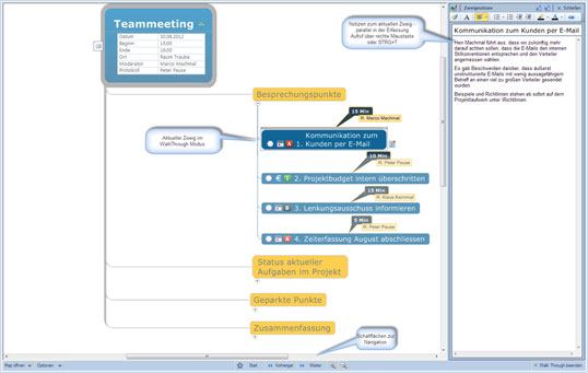 Wer gerne die komplette Map und damit die Agenda während der Besprechung im Überblick hat, wählt den Walk-Through-Modus. Dieser stellt die Map in die Mitte der Darstellung. Mit Hilfe der Navigationsschaltflächen am unteren Bildrand können Sie Schritt für Schritt durch die einzelnen Zweige navigieren und die Besprechungsinhalte gleichzeitig im Fenster "Zweignotizen" protokollieren. Einstellmöglichkeiten – z.B. um die Menüleiste einzublenden – finden Sie im Dropdown-Menü "Optionen" am unteren Bildrand.